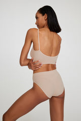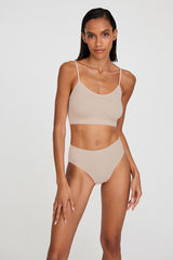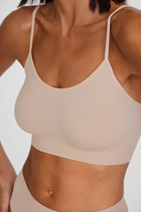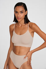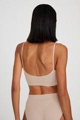 Ein eleganter Top mit einem V-förmigen Ausschnitt ist aus seidiger Mikrofaser nach moderner nahtloser Technologie hergestellt. Schmale elastische Träger sind nicht in der Länge verstellbar. Ein breites, einteiliges Gummiband an der Unterseite dieses Kleidungsstücks und lockige, gerippte Einsätze stützen die Brust gut. Der Top passt den BH-Größen A, B und C.