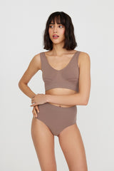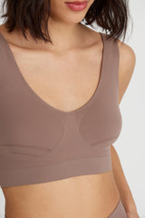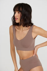 Un top suave y sin costuras con tirantes anchos hecho de microfibra sedosa. El modelo tiene un escote en forma de V y una banda elástica ajustada en la parte inferior, que resalta aún más el pecho. El top tiene inserciones texturizadas en los laterales y en el centro del pecho para un ajuste cómodo. Será una gran opción para todos los días y combina de maravilla con cárdigans y chaquetas de chándal deportivas.