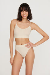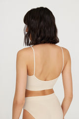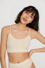 Un haut élégant avec un décolleté en V est fabriqué à l'aide d'une technologie sans couture moderne en microfibre soyeuse. Les fines bretelles de la bande élastique ne sont pas réglables en longueur. Une large élastique en tricot entier dans la partie inférieure du produit et les insertions sculptées en rayure soutiennent confortablement le buste. Le top convient aux seins des tailles A, B, C.