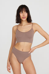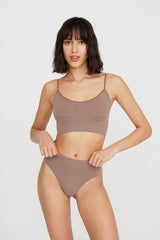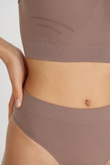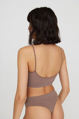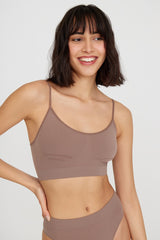 Un haut élégant avec un décolleté en V est fabriqué à l'aide d'une technologie sans couture moderne en microfibre soyeuse. Les fines bretelles de la bande élastique ne sont pas réglables en longueur. Une large élastique en tricot entier dans la partie inférieure du produit et les insertions sculptées en rayure soutiennent confortablement le buste. Le top convient aux seins des tailles A, B, C.